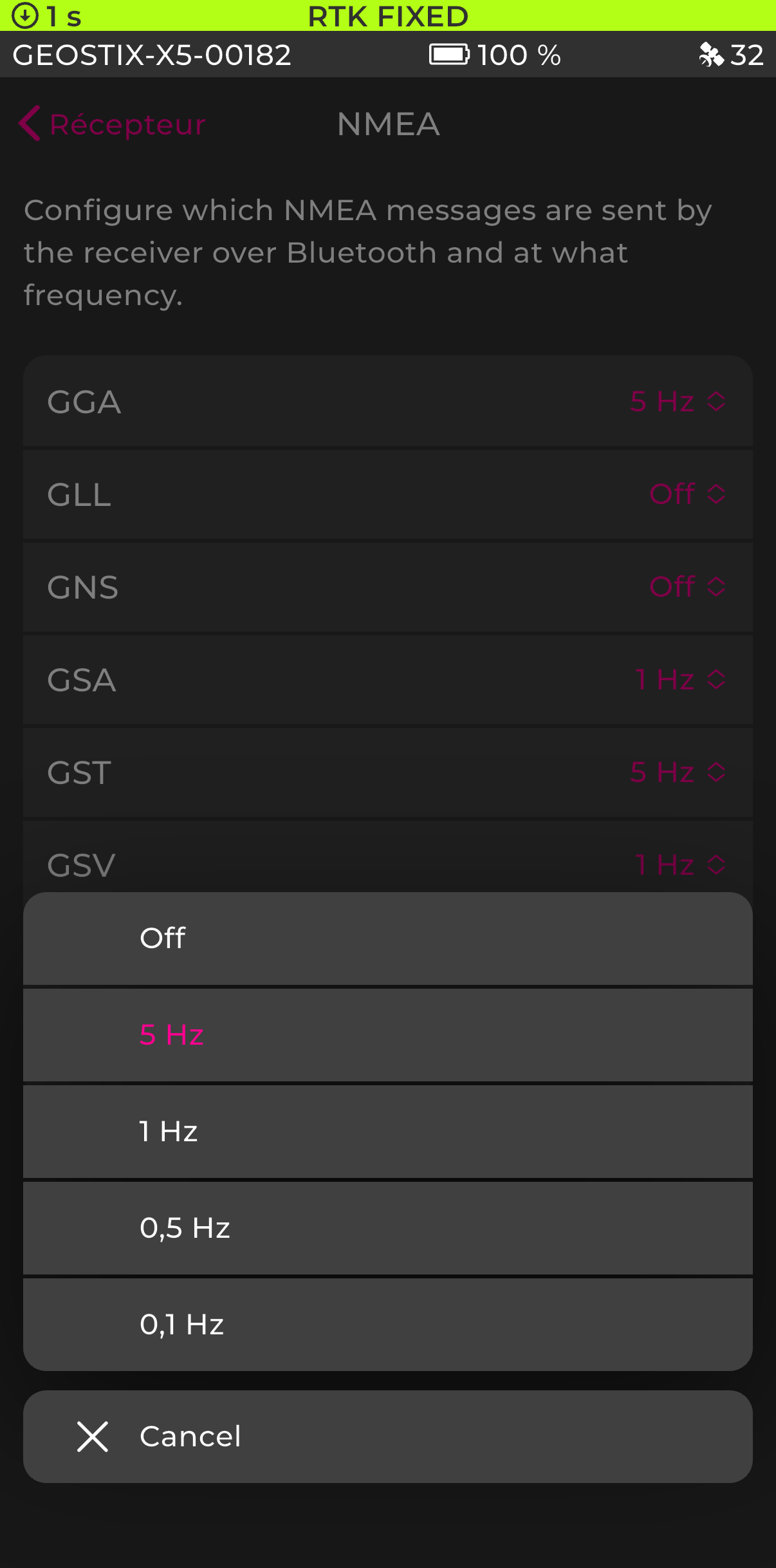 From the Receiver screen, tap NMEA Output. This screen lists all configurable NMEA messages and their current output rate.