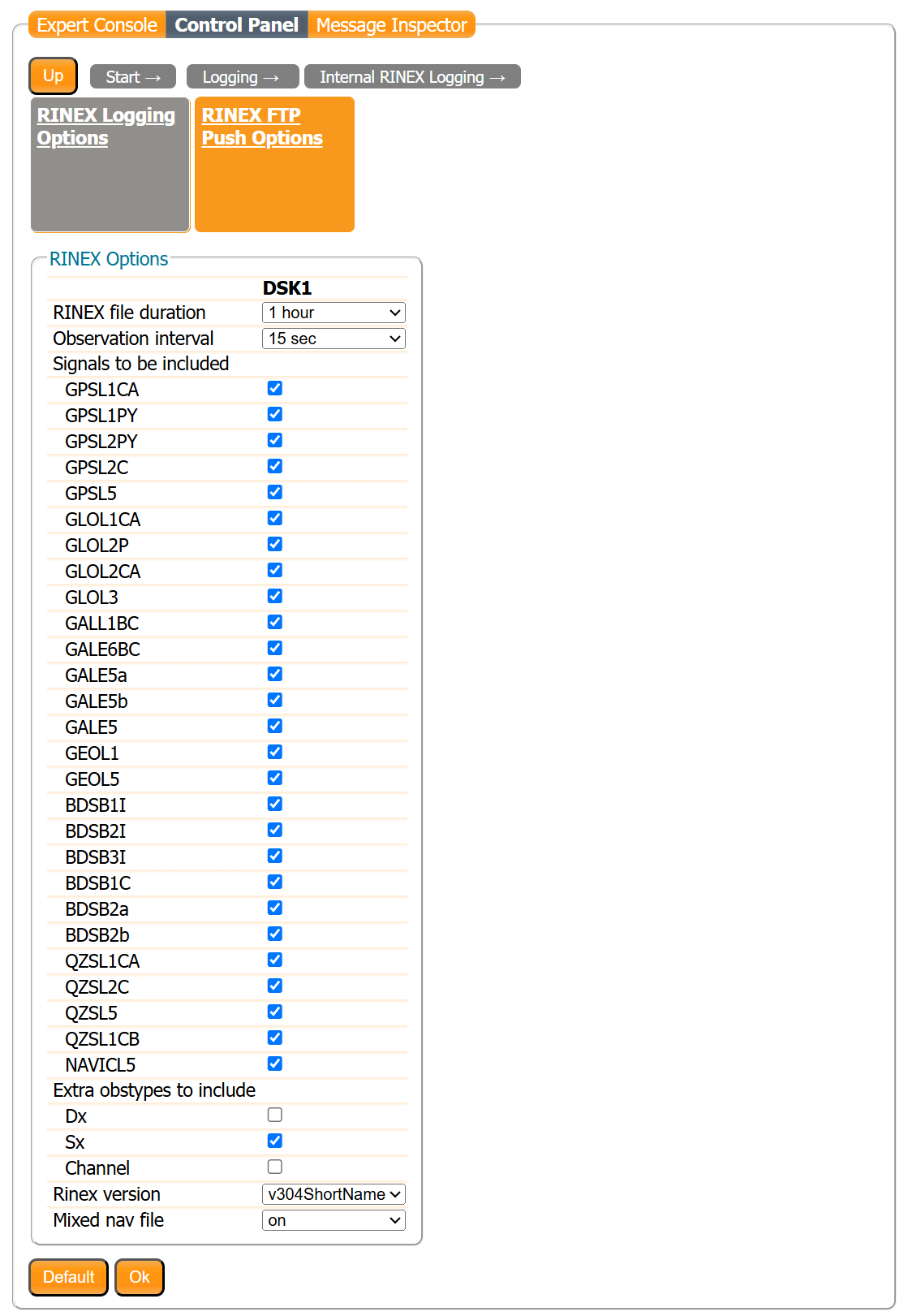 Here is the RINEX saving configuration interface: You can then configure hourly or daily saving, frequency, or the RINEX format version.