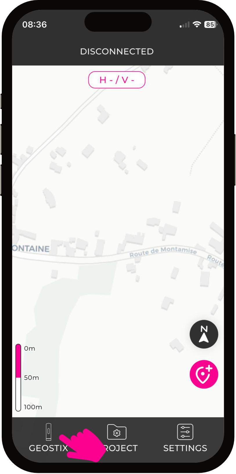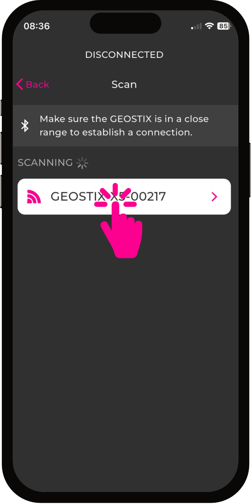 Tap the GEOSTIX icon at the bottom left. Select the GEOSTIX device that just appeared: it is now connected to your smartphone.