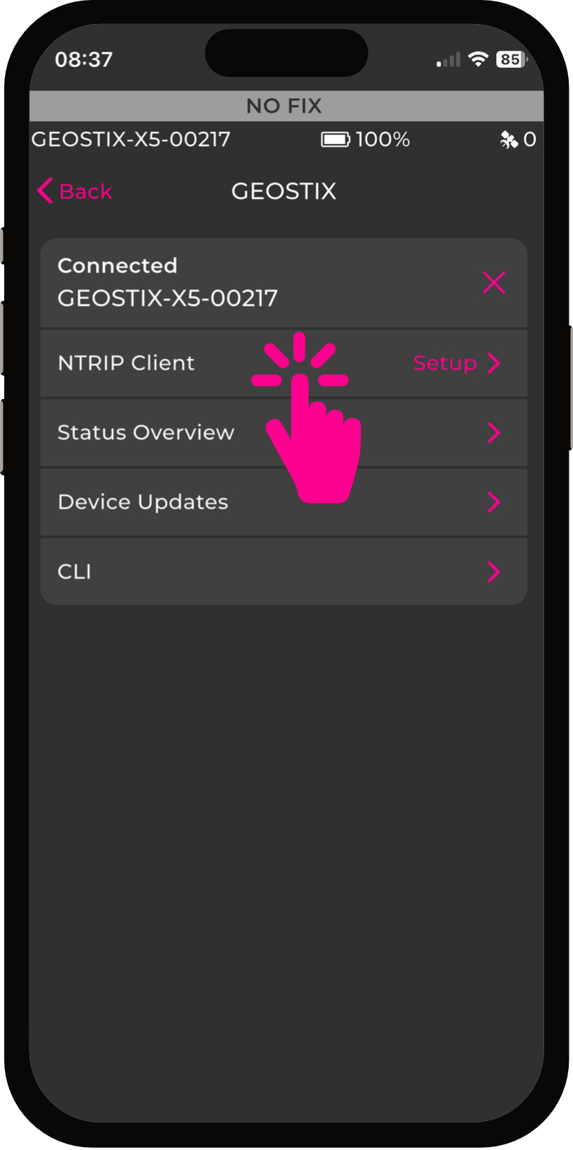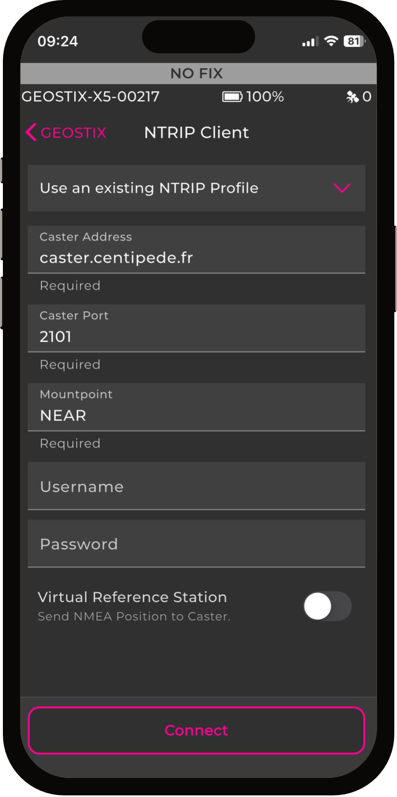 Tap “NTRIP setup” and enter the correction server connection parameters.
